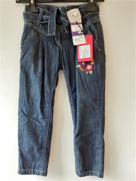 Egyenes szárú bélelt lányka farmer nadrág. Dereka belső gumival és gombbal állitható, kivül saját anyagából készült megkötős övvel erősíthető. Anyaga 100% pamut, 30°C-on mosható.
